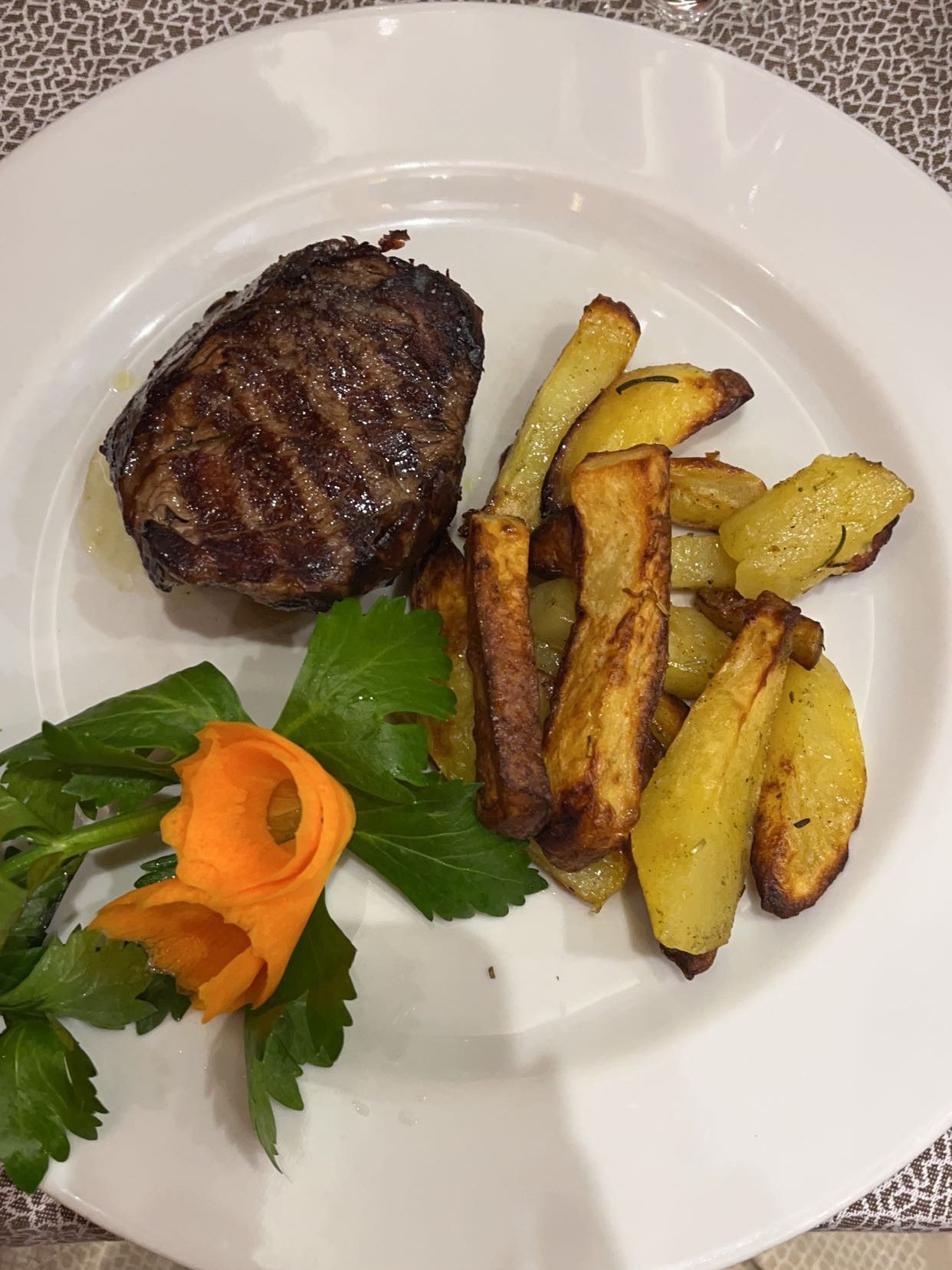 4/5 Filetto di Manzo alla Griglia: For its price point, I would say this filetto is excellent. However, I had to take one star off because it was slightly tougher to eat. Still a real filet regardless and cooked perfectly medium. However, it for some reason was not extremely tender and still had some bite to it. I could have enjoyed a sauce of some sort as well with the filet. The potatoes were perfect. That being said, I would still probably order this dish as my secondi every time because I love steak.