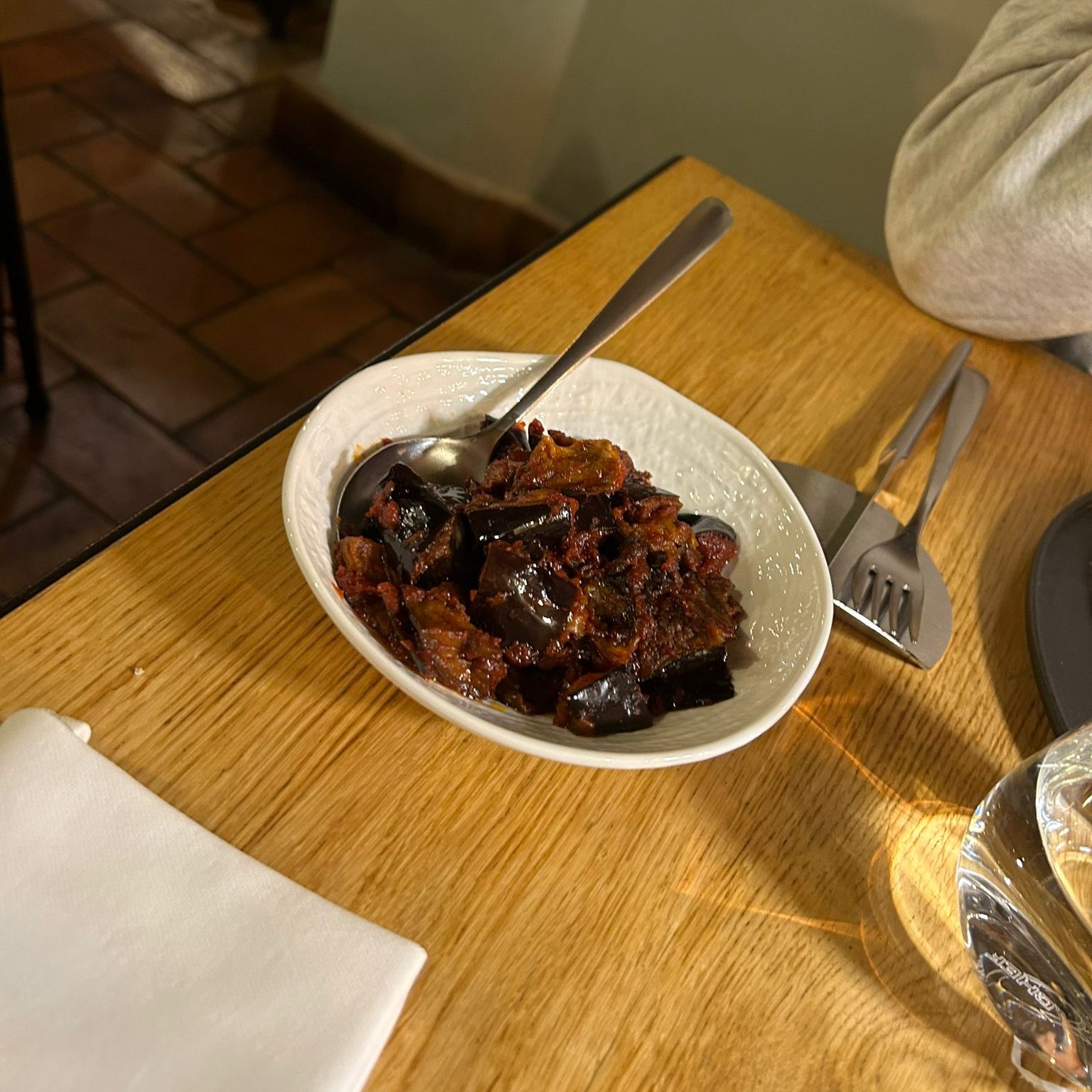 Sebbene non avessi ordinato antipasti, mi hanno offerto un piatto di melanzane da accompagnare con del pane. Ho apprezzato molto ciò e sebbene non ami particolarmente le melanzane, me le hanno fatte piacere.