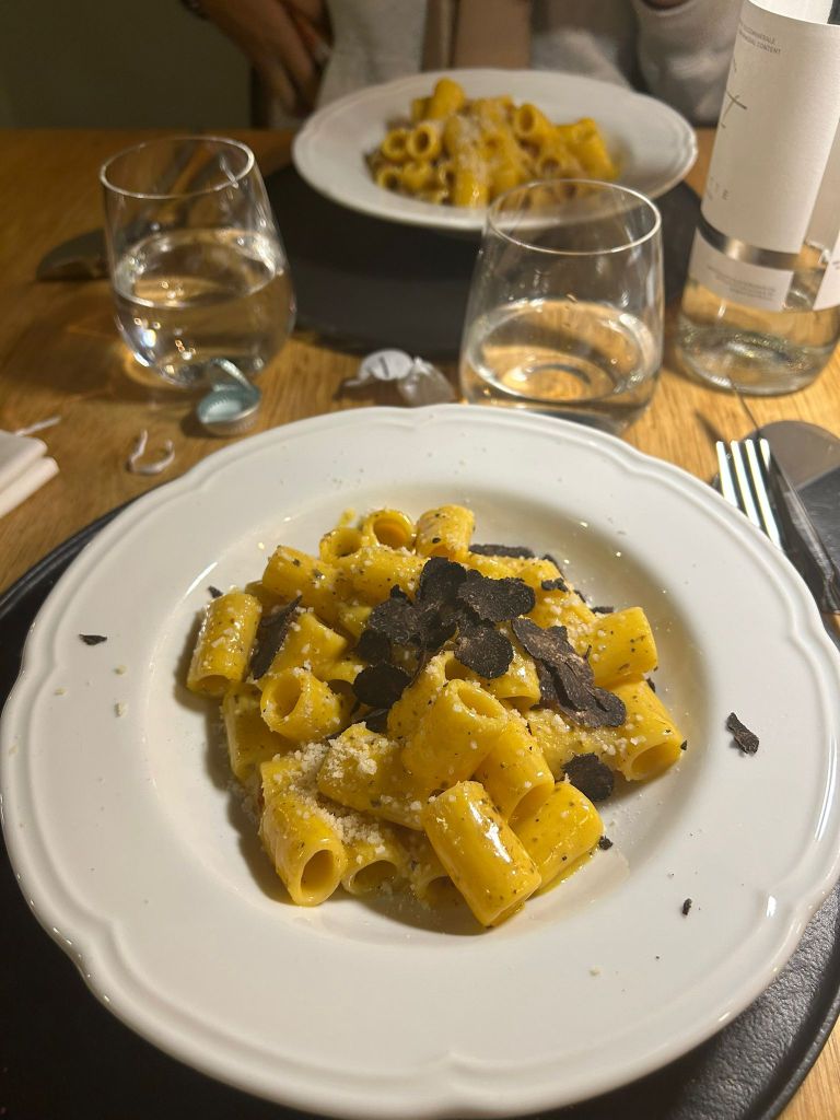 Come primo, ho scelto un classico della cucina romana leggermente rivisitato , cioè delle mezze maniche alla carbonara e tartufo nero. Il piatto era saporito al punto giusto e le scaglie di tartufo erano mischiate nella crema della carbonara in modo da renderla più piacevole.