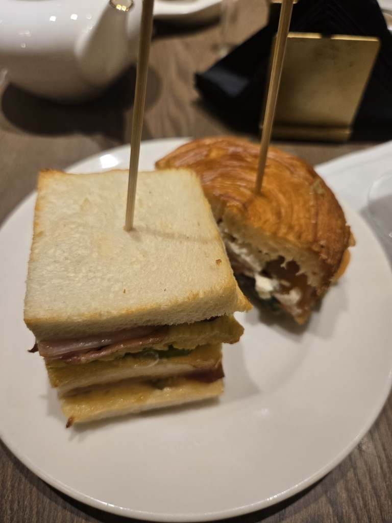 The Food: I ordered a Bellini and Paolo ordered a tea. For food, we wanted to have an aperitif but were told (in Italian I didn’t catch all of it something like it starts at 5/5:30pm…the awkward part is that it was 4:52pm so it was a bit annoying and later I checked the website and it actually starts at 6pm lol.) Instead we had half of each other’s sanwiches: the Club Sandwich with turkey ham, fresh tomato, lettuce and crispy bacon and the Cruffin with salmon, avocado, creme franche, fresh tomato, lettuce. For dessert we shared a chocolate dessert…I forgot what it was called but it was rectangular.
